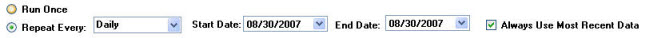 Under Automation, accept the default toRun Once or click the option to Repeat. The option to Always Use Most Recent Data is checked by default. If this option is unchecked, the database that was used when the file was first generated will be used again.